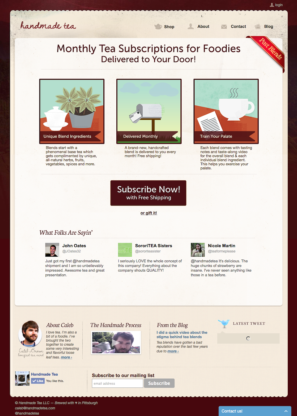 As a tea lover, I started Handmade Tea in 2011. I deliver a new loose leaf tea blend with tasting notes every month to over 100 customers. Gary Vaynerchuk was an early investor and it has been featured in Wired, BuzzFeed, NY Magazine, and more.