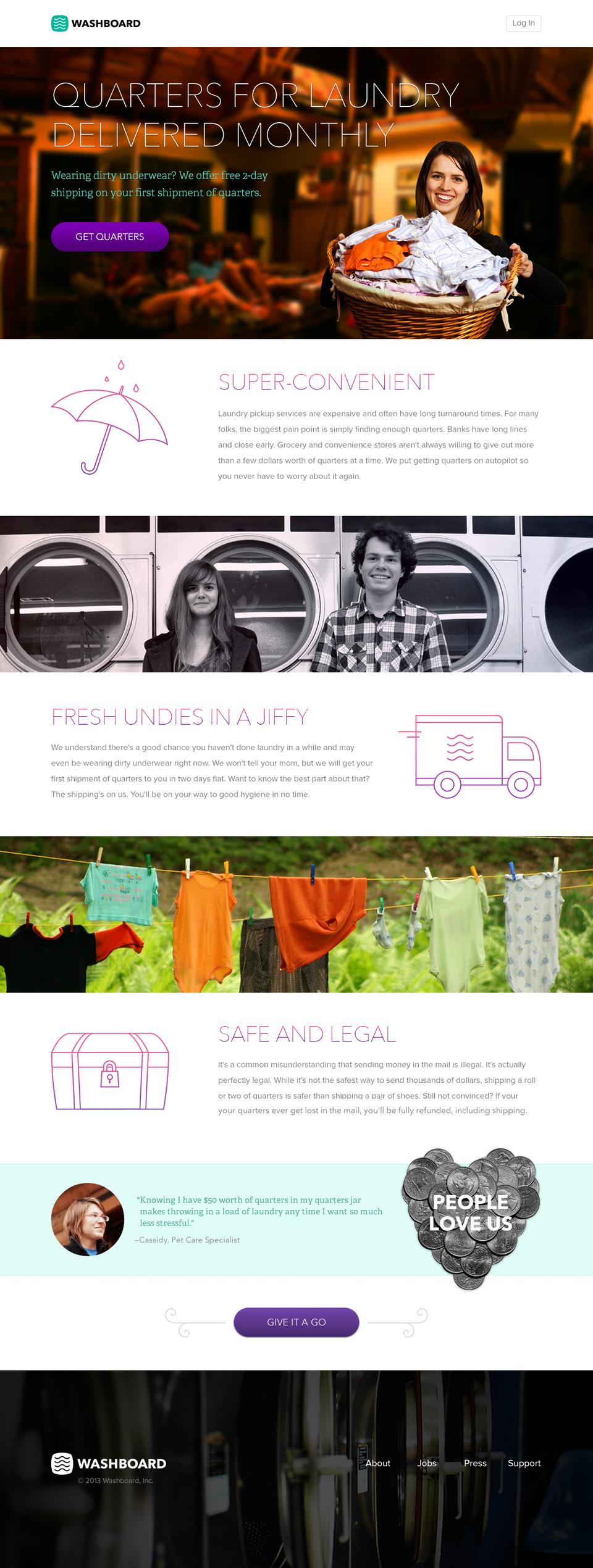 I built Washboard with my friend Shaun to solve a problem we both experienced: hating going to the bank yet constantly needing quarters for laundry. We delivered quarters via snail mail as a subscription to customers that had laundry services on-site at their apartment building but no change machine, thus saving them a trip to the bank.