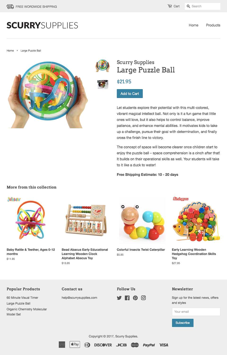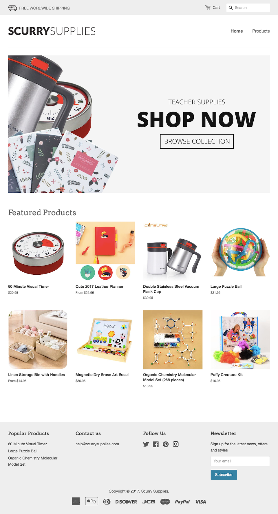 Scurry Supplies is a curated educational marketplace for K-6 teachers. I created Scurry Supplies as an experiment that would allow me to learn more about the world of dropshipping and gain experience outsourcing product descriptions. I chose educational products as my niche because my other projects, Sqworl and Otter, together have nearly 70,000 registered educators which makes for a great audience.