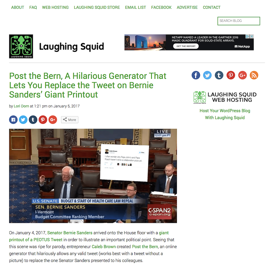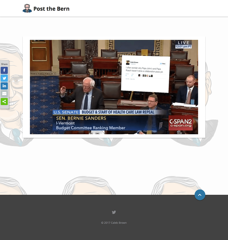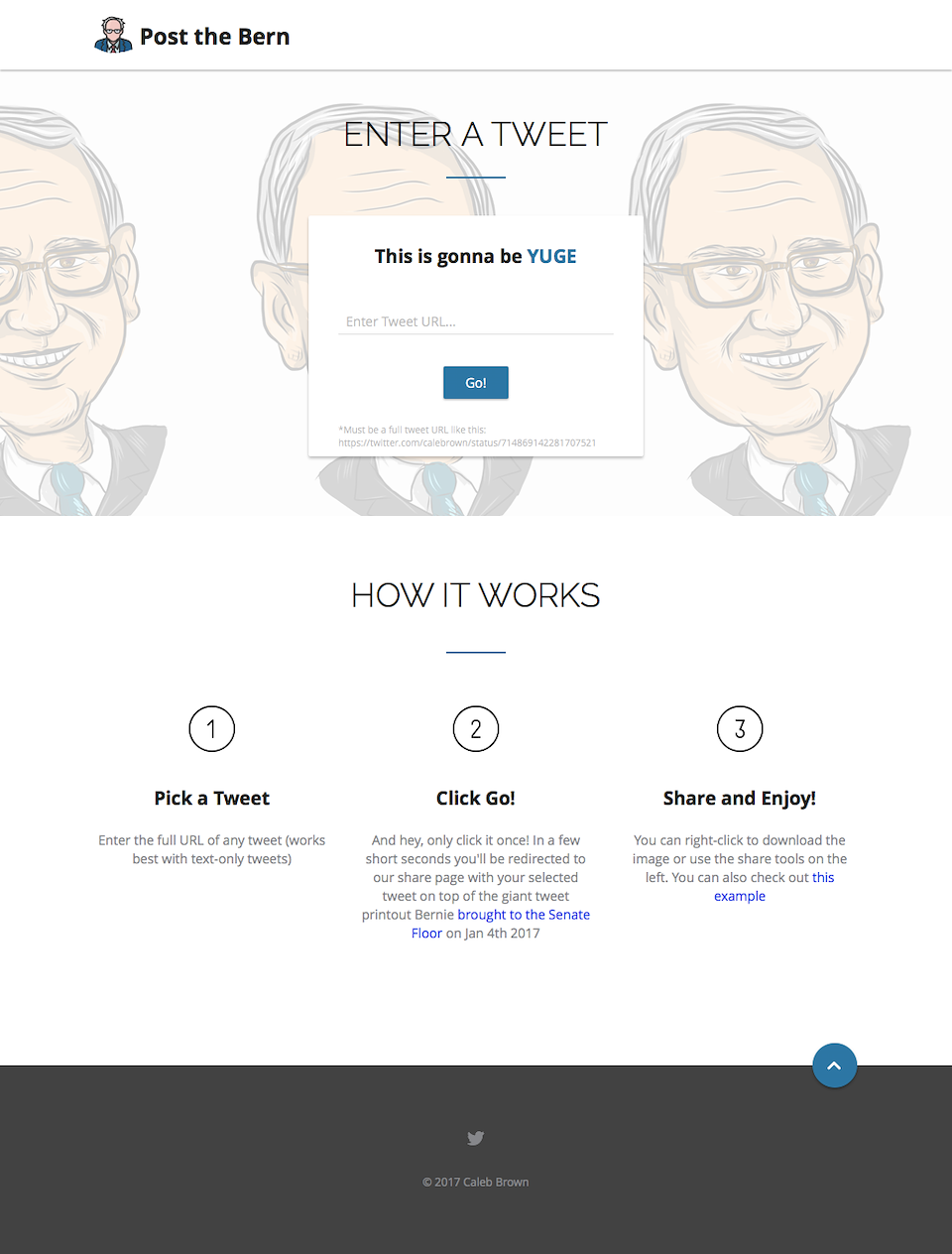 Post the Bern is a fun project I did in a few hours on January 4th, 2017. On that day, Bernie Sanders brought a giant printout of a Donald Trump tweet to Senate floor. Shortly after, I noticed people were posting their photoshopped versions of different tweets to Twitter. Post the Bern allows people to replace the tweet on Bernie’s board with any tweet they like without image editing software. It also hosts the image for easy social sharing.