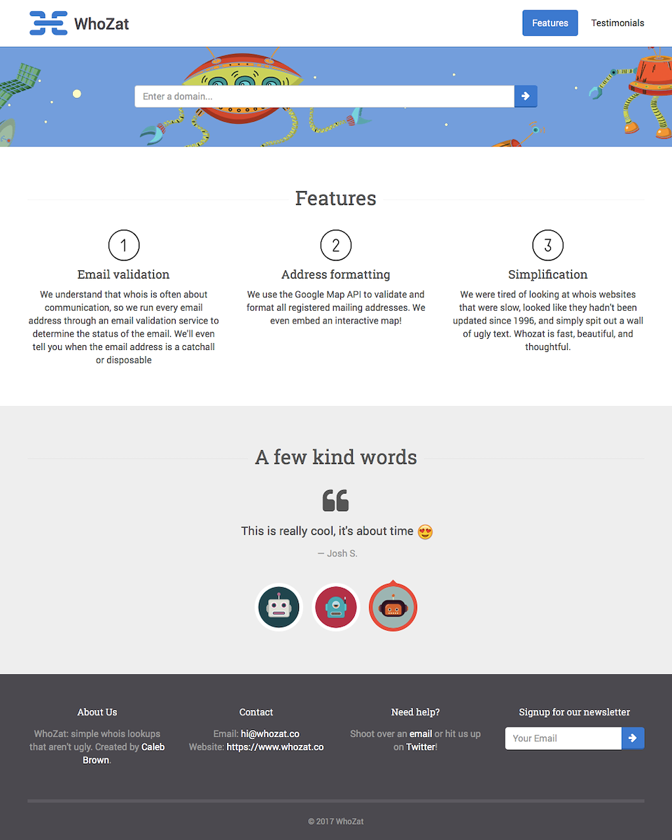 I built WhoZat because I was tired of using whois websites that were slow, outdated, and poorly organized. WhoZat validates registered street addresses with Google Maps, uses NeverBounce to confirm email status (WhoZat even lets you know when an email address is catchall or disposable), and we thoughtfully organize the data structure.