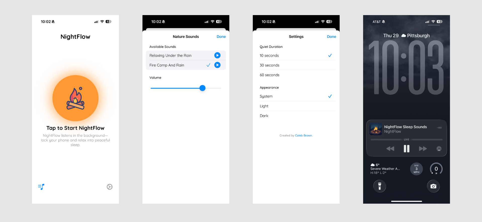 NightFlow helps you fall asleep to TV without leaving it on all night. Start the app, lock your phone, and watch as usual. When your show ends or your TV goes quiet, NightFlow detects the silence and gently fades in calming nature sounds so you drift off without a jarring stop or awkward gap.