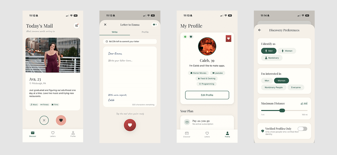 Technically, Postdate combines mobile dating UX with a real-world mail workflow. I built the product around privacy-safe address handling, credit-based purchases for physical sends, and a paired-send exchange system that coordinates both users’ first letters, manages state transitions and expirations, and integrates with a third-party mail API to turn in-app actions into physical delivery.