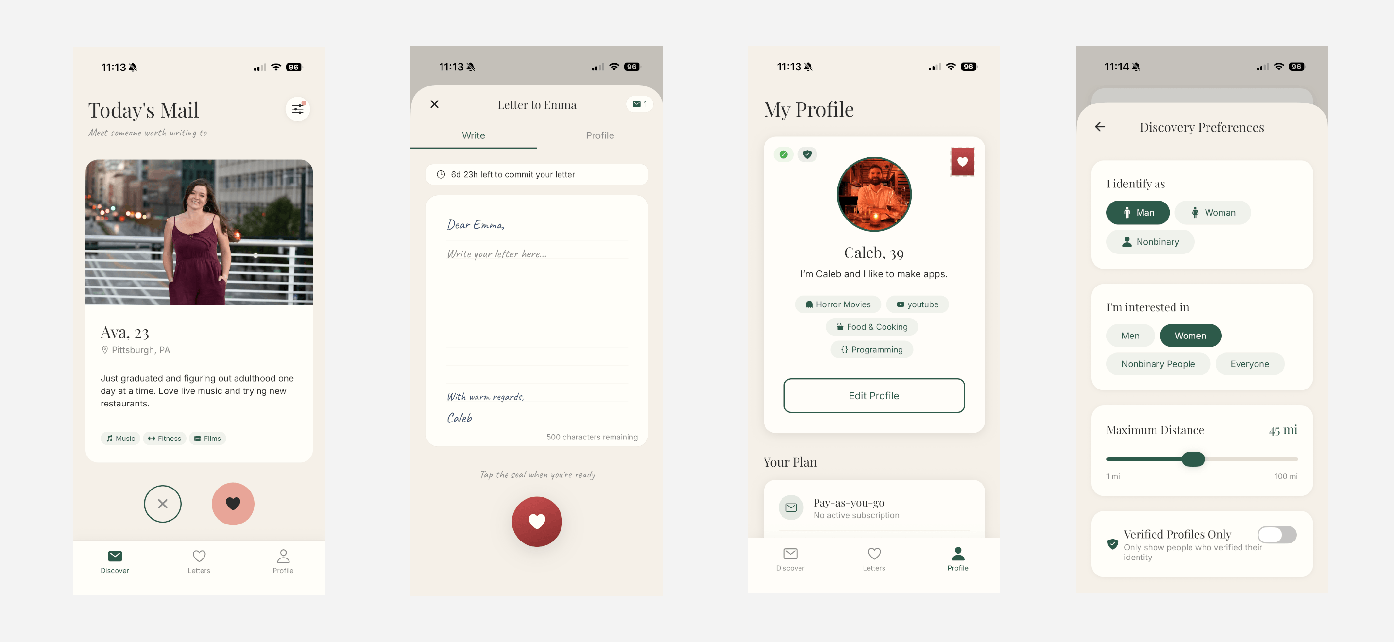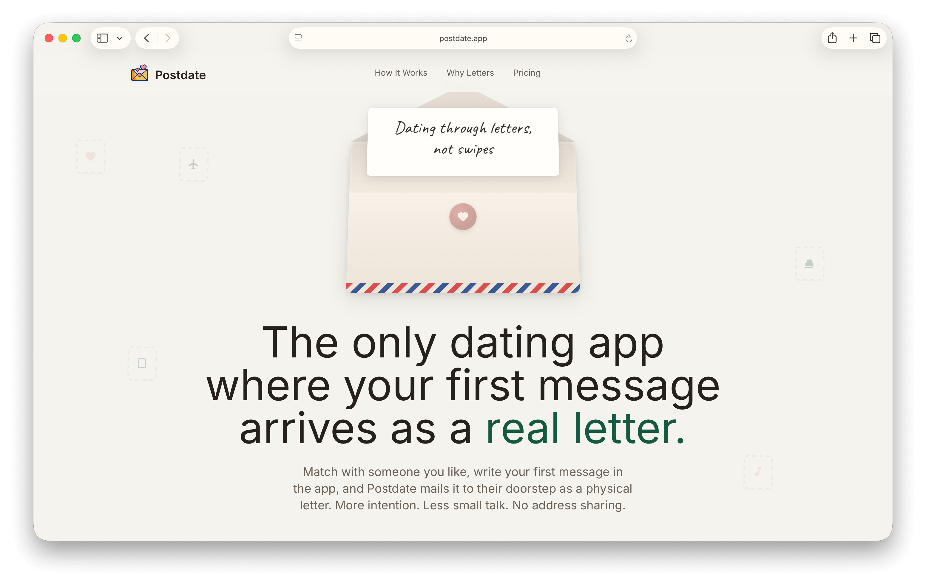 Postdate is a dating app where your first message arrives as a real letter. Users match in the app, write their first message digitally, and Postdate prints and mails it to their match while keeping both mailing addresses private; once the letter arrives, the connection continues in-app.
